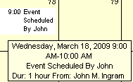 Can schedule into a calendar indirectly from within one's own calendar. The event is added directly into the personal, group, resource or location calendar and can also view the details on the events in the calendar on mouse over, but cannot open the event to see more information or download any attachments. |