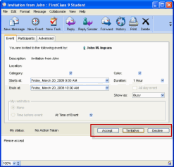 The invitee can, however, change the color, category and reminder as well as choose a new response by clicking on one of the three buttons.