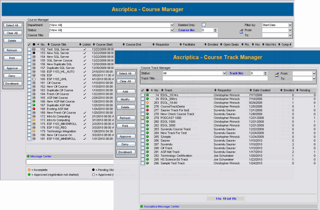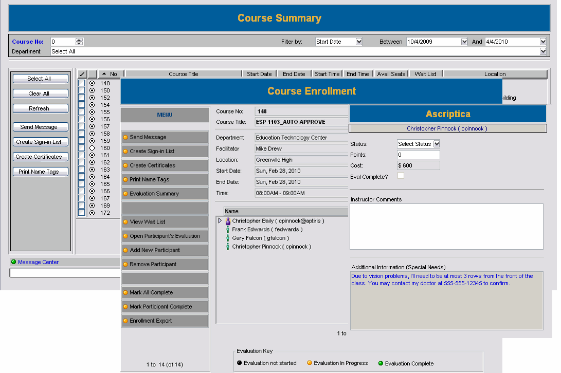• Class Management: View class rosters, wait lists, and use Ascriptica to send delayed or immediate email messages to all participants. Perform common functions such as message blasts and printing individually or in bulk.