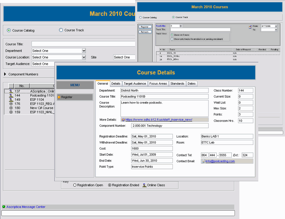 Ascriptica is a comprehensive tool allowing schools and districts to coordinate course offerings and tracking of professional development achievement for any size school or district.  The rich feature set and flexibility, combined with FirstClass integration and competitive pricing, make it an excellent alternative to PDExpress and other stand-alone PD systems.
