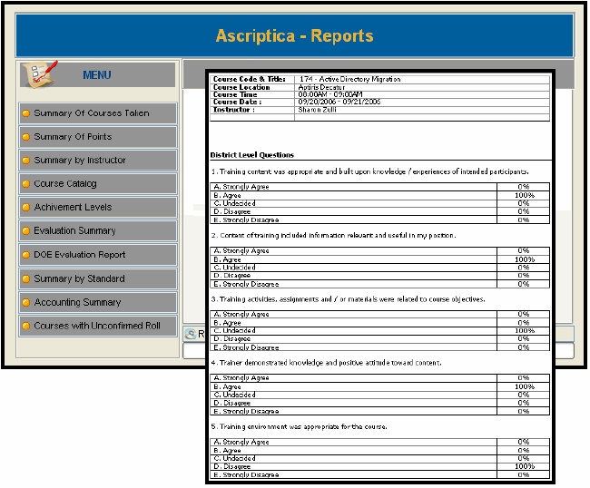 Extensive, flexible reporting is built into Ascriptica at both a system-wide level and on a category basis, giving professional development and departmental administrators the data they require. Some of the pre-defined reports include: